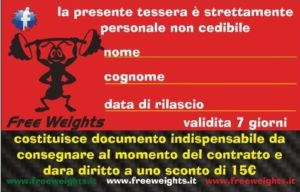 Novità free weights non perdere l'occasione di una prova al costo di 15 € che ti darà il diritto di avere uno sconto di 15 € se ti iscrivi entro 7 giorni sul contratto di abbonamento.